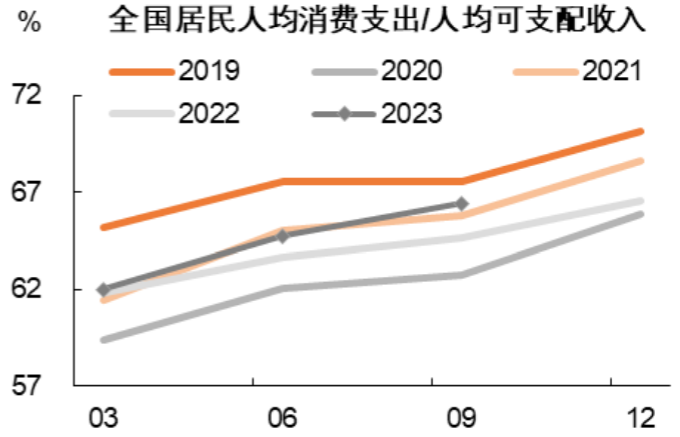 前面我们做了一些消费板块的复盘,接下来我们来梳理一下现阶段实体消费的整体表现。在此之前,我们需要理解消费最终是由收入水平支撑的,居民收入是否改善至关重要。从前三季度数据来看,居民就业和收入随经济复苏获得改善。今年前三季度全国居民人均可支配收入的累计增速为5.9%,比同期实际GDP增速高出0.7个百分点。值得一提的是,前三季度全国居民人均消费支出占人均可支配收入的比例,已高于2021年同期,说明居民消费倾向也在改善。