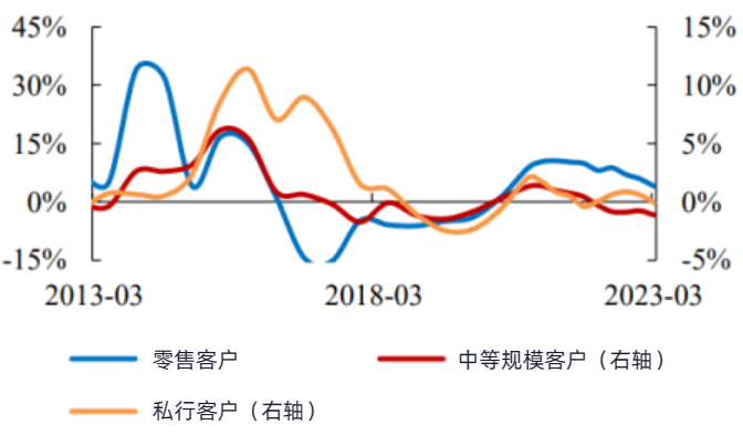 来看一则数据,某上市银行2022年财报显示,其1000万元以上、50-1000万元、50万元以下客户的人均资产规模增速分别为0.6%、-0.8%、6.0%,即代表着财富处于两端的客户的资产在扩张,而代表着中间位置的客户资产受损。