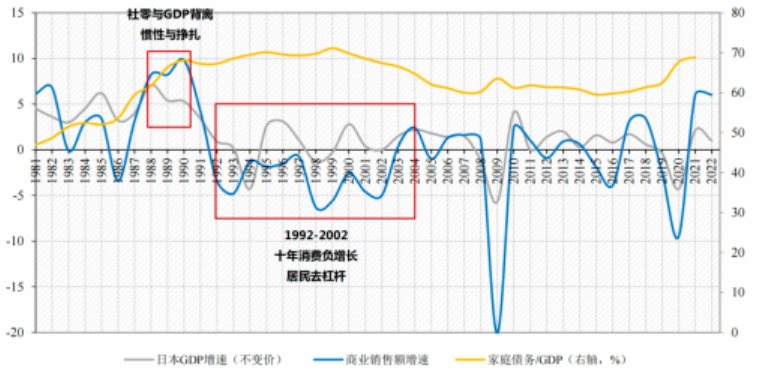 以上的数据很容易让人联想到消费降级,毕竟中产阶层的消费力对经济的影响举足轻重。我国居民固定资产占个人财富的比重较大,而房价上涨带来的财富效应在过去几十年对消费的正向影响非常显著,即房价涨了让人感觉财富快速增长,从而倾向于更强的消费偏好。而当下楼市进入调整阶段,财富效应消失后人们会选择降低消费来抵御未来的不确定性。以日本为例,真正对消费冲击巨大的是在房价不断下跌的1992-2002年这个阶段。