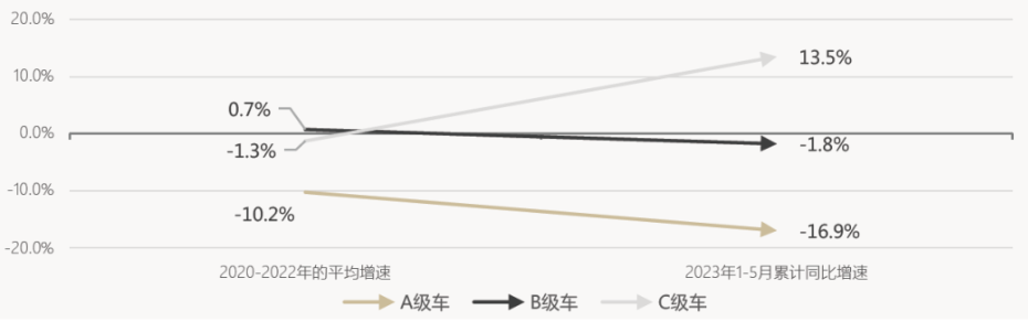 不同等级乘用车的销售表现也值得关注,乘联会数据显示,2023年1-5月,售价较低的紧凑型A级车销量同比大幅下降,较2020-2022年的平均销售降幅继续扩大;而中端B级车同期的销量表现相较于2020-2022年的平均表现基本持平;在更高端的C级车方面,今年则较去年同期多增了13.5%,较2020-2022年的平均销售增速大幅提升,分化非常显著。