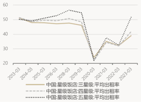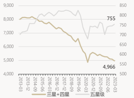 再来看看出行方面,各星级酒店的经营情况同样也呈现K型分化特征,其典型现象是五星酒店经营向好,而三四星酒店经营面临挑战。今年以来,五星级酒店客房出租率基本恢复至2013-2019年的平均水平,而三星、四星酒店的出租率较前期平均水平仍有一定差距。同时,五星级酒店数量在2020年下滑后,目前正企稳回升,三四星酒店数量则在持续下滑中。